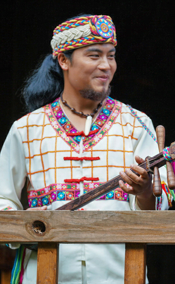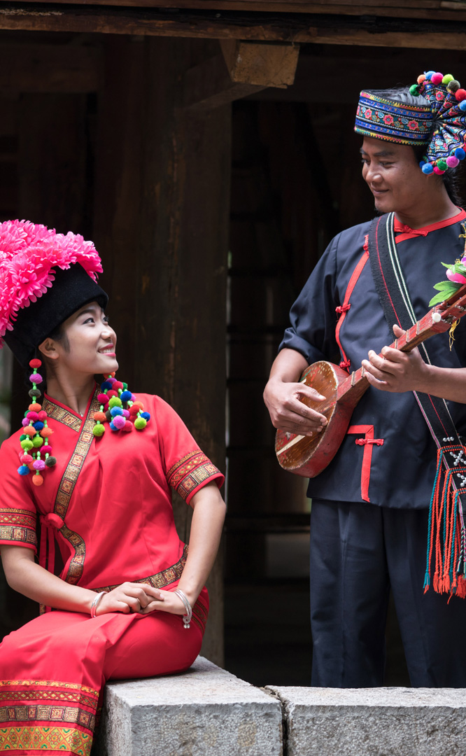 云南壯族主要聚居在文山州,人口114萬,民間的村寨大多依山傍水。壯族擅長種植水稻,有太陽崇拜和長老崇拜的風俗,視銅鼓為重器,厚愛銀飾,善烹制五色花米飯,能歌善舞,熱情好客。進入景區(qū)壯族村,迎面有祭祀龍王的龍柱,兩邊是先民繪制的天王崖畫和為紀念傳說洪水泛濫時幫助先民度過劫難而建的石葫蘆亭。祭祀玉皇大帝的昊天閣和傳說能驅邪納福的碩大銅鼓聳立在廣場兩側。桿欄式和麻欄式民居、壯族青年社交休憩的“情廊”、村...