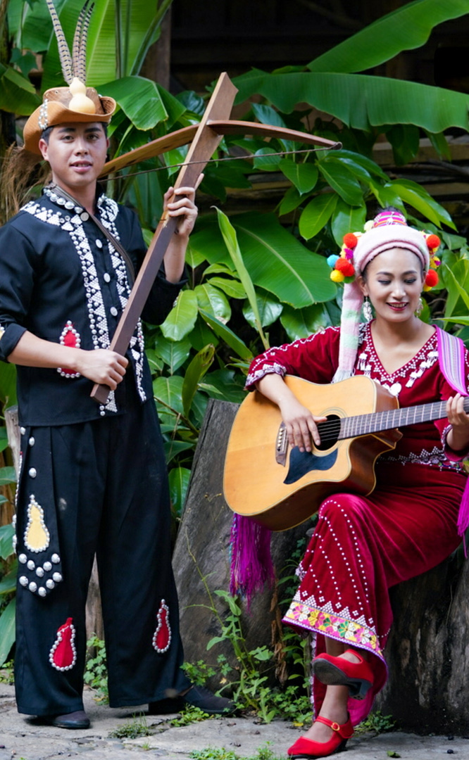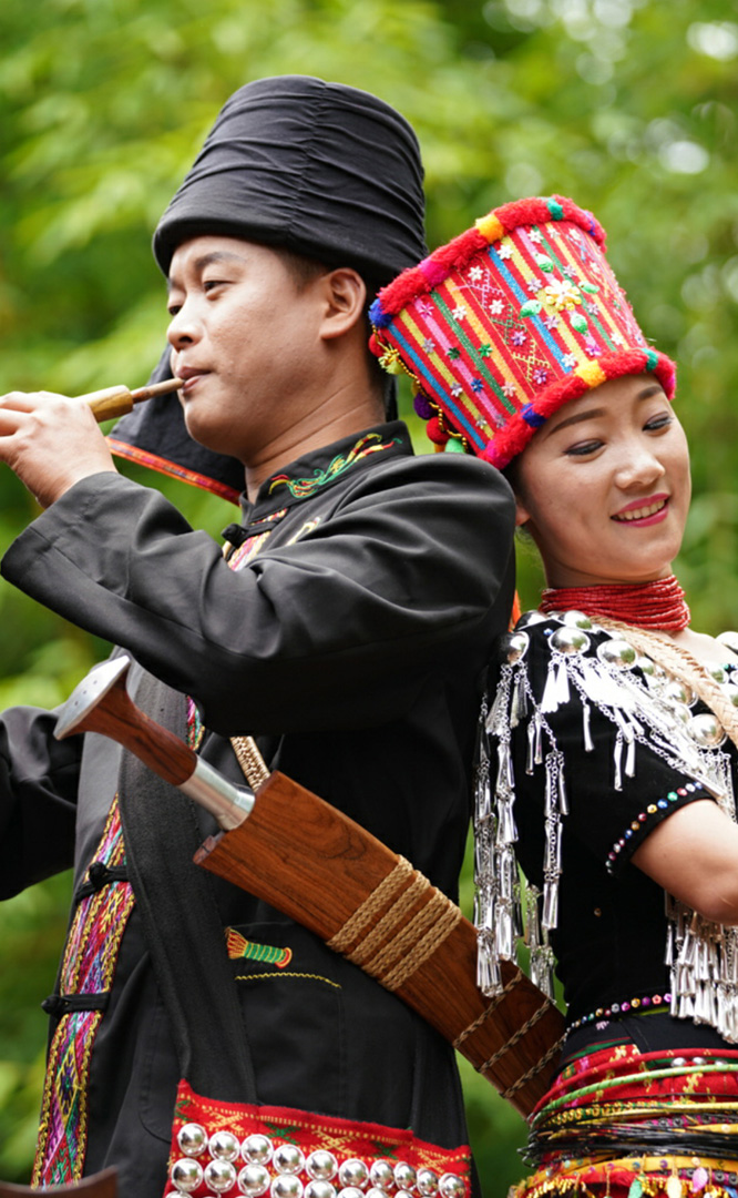 拉祜族人口約41萬,主要聚居在思茅、臨滄境內(nèi)的瀾滄江沿岸地區(qū)。拉祜族寨與基諾族寨緊緊毗連,寨內(nèi)建有拉祜族茅草房、大公房、教堂、牛棚以及葫蘆廣場。位于拉祜族寨中心位置的葫蘆廣場形似一只碩大的葫蘆平面,核心有一組石雕葫蘆。傳說拉祜族的祖先誕生于葫蘆中,因此葫蘆廣場表現(xiàn)了拉祜族的祖先崇拜觀念。漫步拉祜族寨,葫蘆笙悠揚婉轉、口弦聲余音繞梁,表現(xiàn)拉祜族勞動場面的“豐收擺舞”充滿歡騰和激情,展示了拉祜族的民間...